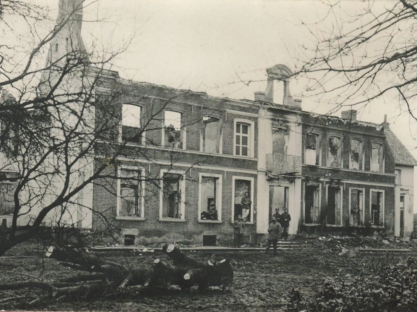 Le château incendié est photographie de Nicolas Hiessler qui a servi comme sergent infirmier à la Bayerische Sanitats Krafwagen Abtellung 6. A ce titre il a participé à des combats de position en Flandre et en Artois. Des albums photographiques attestent de son passage dans le secteur de Lens : Méricourt - Loison sous Lens - Pont à Vendin - Hénin-Liétard ...